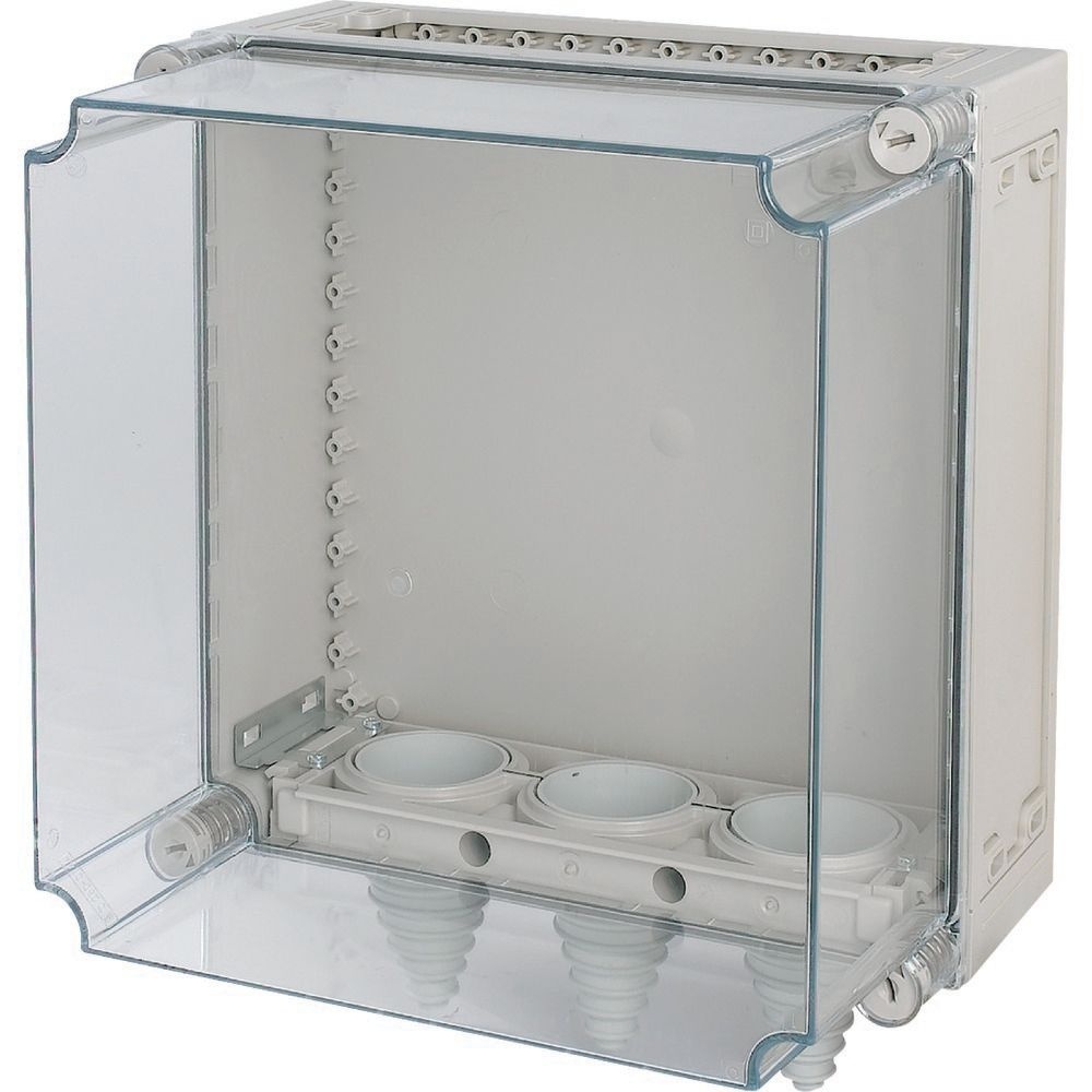 Eaton Verteilergehäuse 095877 Typ KST44-250 Verteilergehäuse, mit Flanschplatte und Kabelstutzen, HxBxT=375x375x275mm Basisgehäuse Stromverteiler mit montierten Kabelstutzen, Material: Polycarbonat, schlagfest, Schutzart IP65, patentierter Deckelverschluss mit integriertem Überdruckausgleich, Gehäuseseitenwände geschlossen, ausschlagbar, Wände oben oder unten offen, Leitungen von vorne einlegbar durch geteilte Kabelschellen, plombierbare Deckelverschlüsse, RAL 7035, Grau (Sockel), transparent rauchgrau, (Abdeckung), Einbautiefe bei Montageplatte=250mm, Abdeckungstyp: transparent rauchgrau, Ausführung Unterteil: oben offen unten Kabelstutzen Hersteller Eaton Nr. 095877 Typ KST44-250 EAN Nr. 4015080958772 Warengruppe Eaton Isolierstoffgehäuse