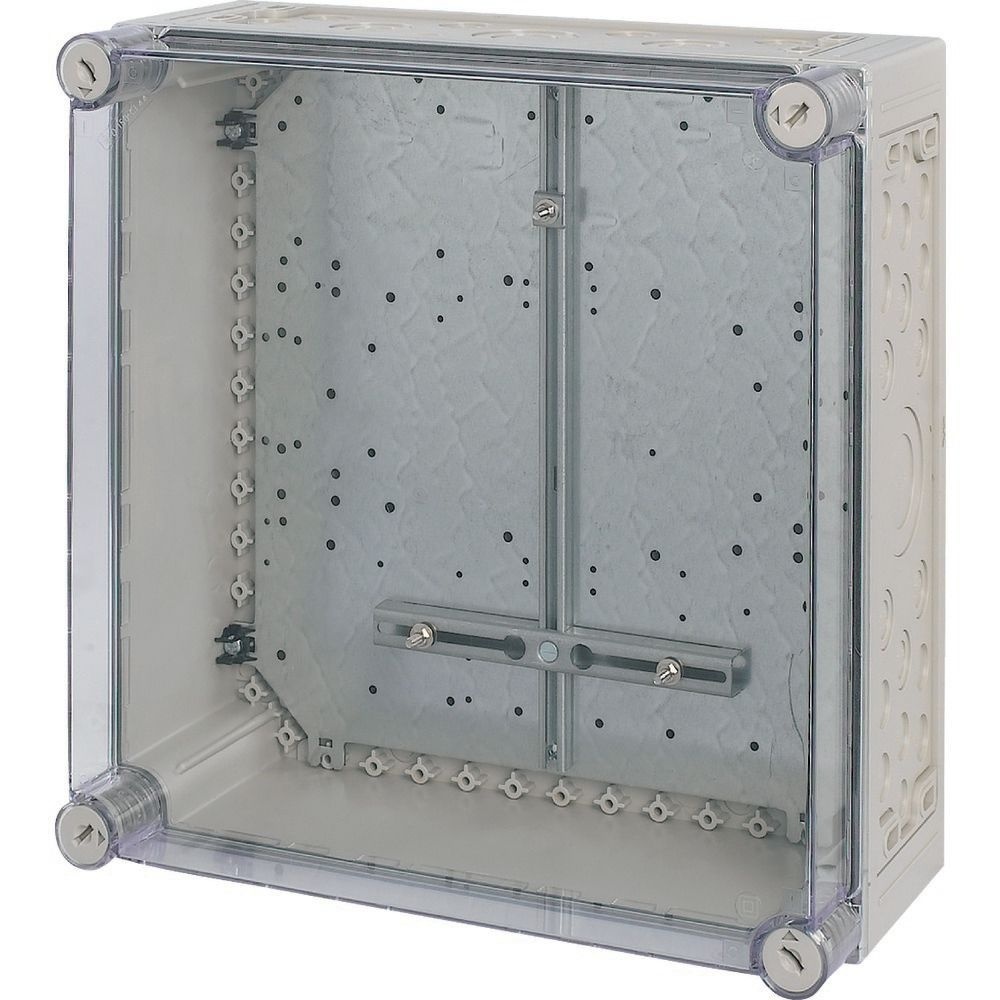 Eaton Zählergehäuse 017897 Typ ZG/I44E-150 Zählergehäuse, HxBxT=375x375x225mm, IP65 Zählergehäuse mit Zählerkreuz, Material: Polycarbonat, schlagfest, patentierter Deckelverschluss mit integriertem Überdruckausgleich, Tiefe=175mm, metrische Vorprägungen für Kabelführungen an allen Seiten, Befestigungsbänder zur Wandbefestigung, plombierbare Befestigungen am oberen Rand der Abdeckung, Zählerkreuz nach DIN 43853 einschließlich Zählerbefestigungsschrauben und Muttern, Schutzart IP65, Abdeckungstyp: transparent rauchgrau Hersteller Eaton Nr. 017897 Typ ZG/I44E-150 EAN Nr. 4015080178972 Warengruppe Eaton Isolierstoffgehäuse