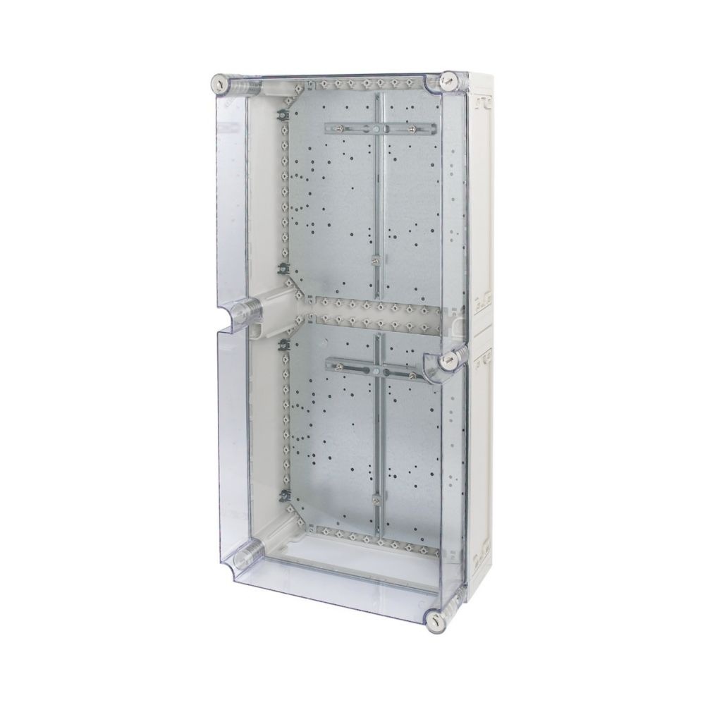 Eaton Zählergehäuse 022643 Typ ZG/I48-200 Zählergehäuse, HxBxT=750x375x225mm, IP65 Zählergehäuse mit Zählerkreuz, Material: Polycarbonat, schlagfest, patentierter Deckelverschluss mit integriertem Überdruckausgleich, Tiefe=225mm, oben und unten ausschlagbar für FL4…Flansch, Befestigungsbänder zur Wandbefestigung, plombierbare Befestigungen am oberen Rand der Abdeckung, Zählerkreuz nach DIN 43853 einschließlich Zählerbefestigungsschrauben und Muttern, Schutzart IP65, Abdeckungstyp: transparent rauchgrau Hersteller Eaton Nr. 022643 Typ ZG/I48-200 EAN Nr. 4015080226437 Warengruppe Eaton Isolierstoffgehäuse