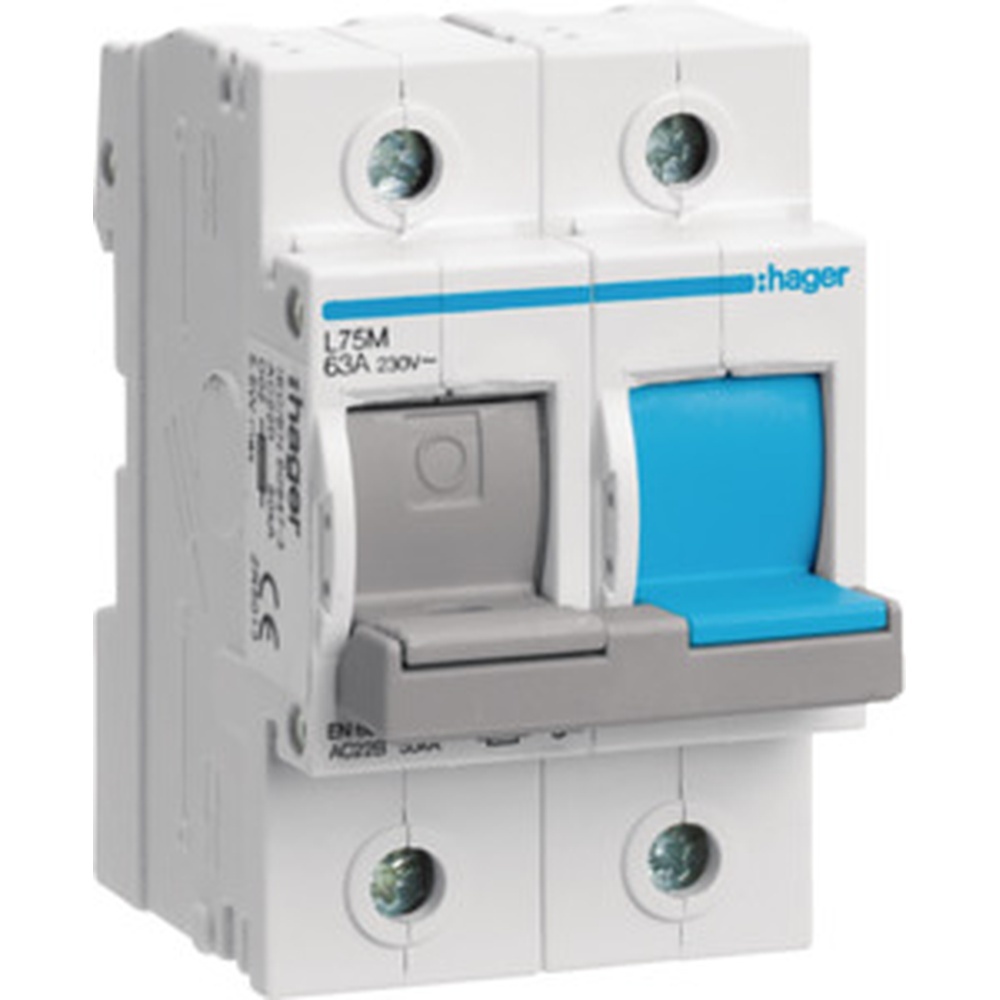 Hager Lasttrennschalter L75M Lasttrennschalter D02, 1P+N 63A Lasttrennschalter für Sicherungen D02 E18 63A AC400V 1polig+N Hutschiene.D0-Sicherungslasttrennschalter zweipolig schaltbar, 1Phasig+Neutralleiter, für D02 Sicherungen, für Hutschienenmontage. Mit Meldesystem für Sicherungsausfall durch LED. Schraubkappenlose Stecktechnik bietet werksseitigen dauerhaften Kontaktdruck. Keine Kontaktlockerung während des Betriebes. Abschließbar mit Vorhängeschloss und plombierbar. Entnehmbarer Sicherungsstecker mit Fingerschutz. Entspricht der Gerätenorm IEC 60947-3. Hersteller Hager Nr. L75M EAN Nr. 3250610740606 Warengruppe Hager Sicherungseinsätze