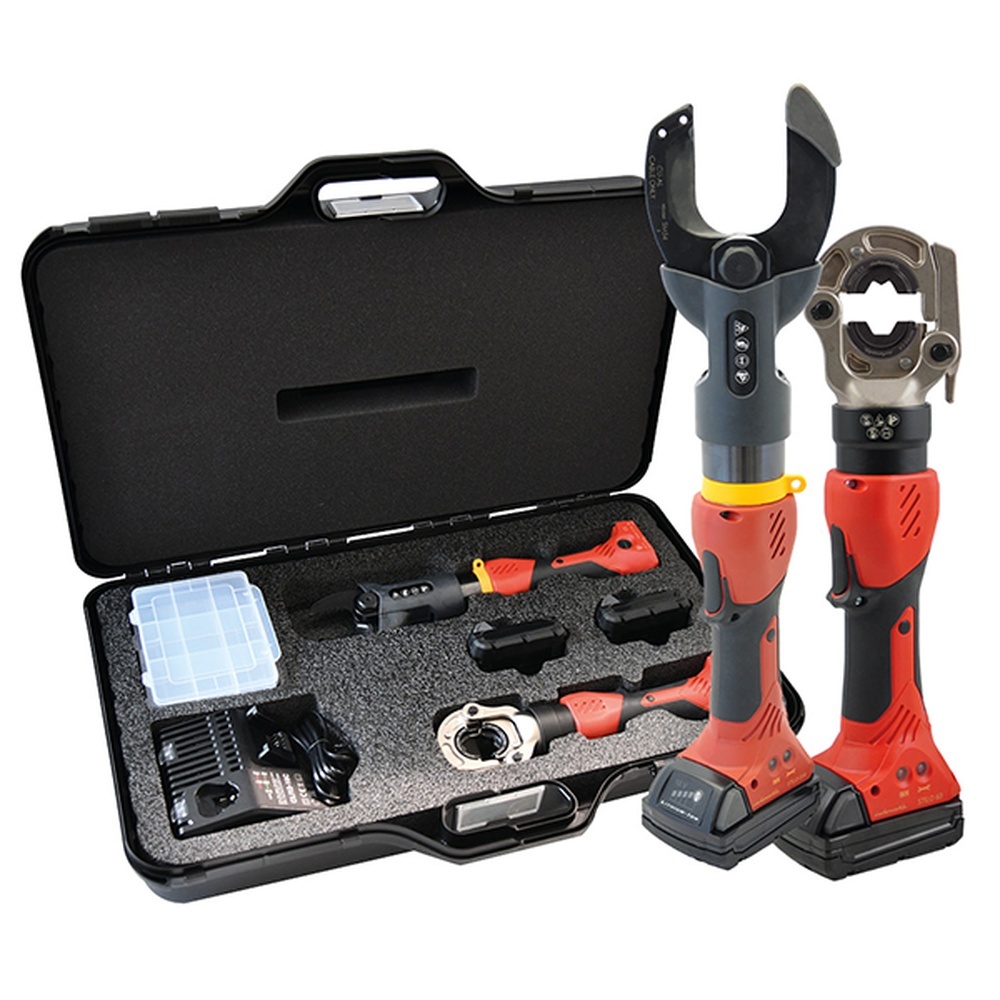 Intercable Werzeugset 716317 Typ STILO-UNI114 Professionelle Werkzeuge im Doppelpack, STILO60 ist geeignet zum Verpressen von Aluminium- und Kupferkabeln bis 300qmm, STILO-S54 ist geeignet zum Schneiden von mehrdrähtigen Aluminium- und Kupferbabeln bis zu einem max. Durchmesser von 54mm, die SET-Bestückung besteht aus der hydraulischen Akkupresse, dem hydraulischen Akkuschneider, einem Kunststoffkoffer zur Aufnahme der Werkzeuge und der Presseinsätze, Bedienungsanleitungen, zwei Li-Ionen Akkus, einem Ladergerät, einem USB-Kabel, Software Hersteller Intercable Tools Nr. 716317 Typ STILO-UNI114 EAN Nr. 8014212550934