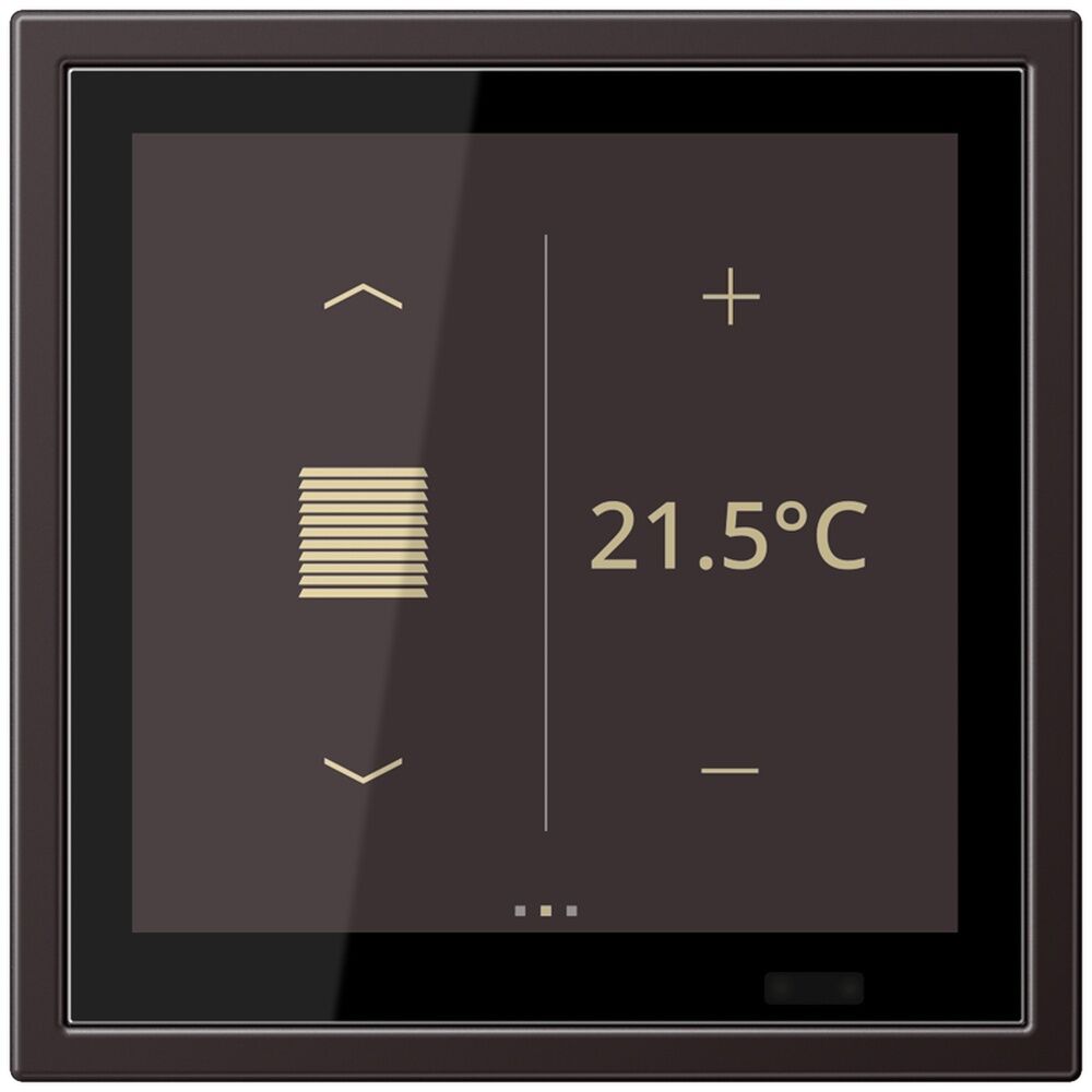 Jung KNX Raumcontroller LSZAL459BFD1SD KNX Raumcontroller LS TOUCH mit Rahmen LS ZERO, Serie LS, dark mit integriertem 1fach-Rahmen LS ZERO inklusive Saugheber (Art.-Nr.: W-HEBER) zur Demontage des Gerätes vom Tragring Nur als Einzelgerät zu montieren! Bestimmungsgemäßer Gebrauch Bedienen von Verbrauchern und Visualisieren von Anlagenzuständen und Informationen, z.B. Licht schalten und dimmen, Behänge steuern, Temperatur- und Verbrauchswerte etc. Messen und Regeln der Raumtemperatur Montage in Gerätedose mit Abmessungen nach DIN 49073 Produkteigenschaften Hochauflösendes IPS Farbdisplay Kapazitiver Touchscreen Funktionen der Favoriten-Seiten einstellbar (ohne ETS) Max. 32 Bedienfunktionen Schalten, Dimmen, Jalousiesteuerung, Wertgeber, Szenenaufruf etc. Integrierter Raumtemperaturfühler Raumtemperaturregelung mit Sollwertvorgabe Alarmfunktion (akustisch und/oder optisch) Max. 8 Zeitschaltfunktionen aktivierbar und einstellbar (abhängig von Uhrzeit, Astro oder Zufall) Integrierter Näherungs- und Helligkeitssensor Integrierter Busankoppler Anschluss von Installationstastern oder Reedkontakten möglich Inbetriebnahme und Unterstützung von KNX Data Secure mit ETS ab Version 5.7.4 Anzeige von Raum- und Soll-Temperatur Fernfühler (Art.-Nr.: FF NTC) anschließbar Anzeige der Außentemperatur – mit externem Sensor, z.B. Wetterstation In Verbindung mit JUNG Smart Visu Server: Steuerung von Musikwiedergabe und Lautstärkeregelung Hersteller Jung EAN Nr. 4011377206670 Warengruppe Jung Serie LS