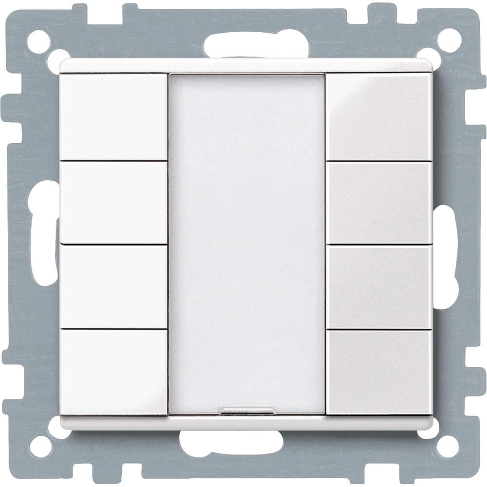 Schneider Electric Taster MTN617419 Taster 4fach plus, polarweiß glänzend, System M Im Design System M. Mit integriertem Busankoppler. Taster mit 8 Bedientasten, Betriebs-, Statusanzeige und Schriftfeld. Die Betriebsanzeige kann auch als Orientierungslicht verwendet werden. Das Gerät wird über eine Busanschlussklemme mit der Busleitung verbunden. Softwarefunktionen KNX Schalten, Umschalten, Dimmen (ein-/zweiflächig), Jalousie (ein-/zweiflächig). Flanken löst 1,- 2-, 4- oder 8-Bit-Telegramme aus (Unterscheidung kurze/lange Betätigung). Flanken mit 2-Byte-Telegrammen (Unterscheidung kurze/lange Betätigung), 8-Bit-Schieberegler, Szenenabruf, Szenenspeicherung, Sperrfunktionen. Zubehör Beschriftungsbogen für Taster MTN6183xx Lieferumfang Mit Putzschutzhaube. Mit Busanschlussklemme. Material Thermoplast brillant. Farbe polarweiß glänzend. Hersteller Schneider Electric Nr. MTN617419 EAN Nr. 3606485099453 Warengruppe Schneider Electric Kanaleinbaugeräte