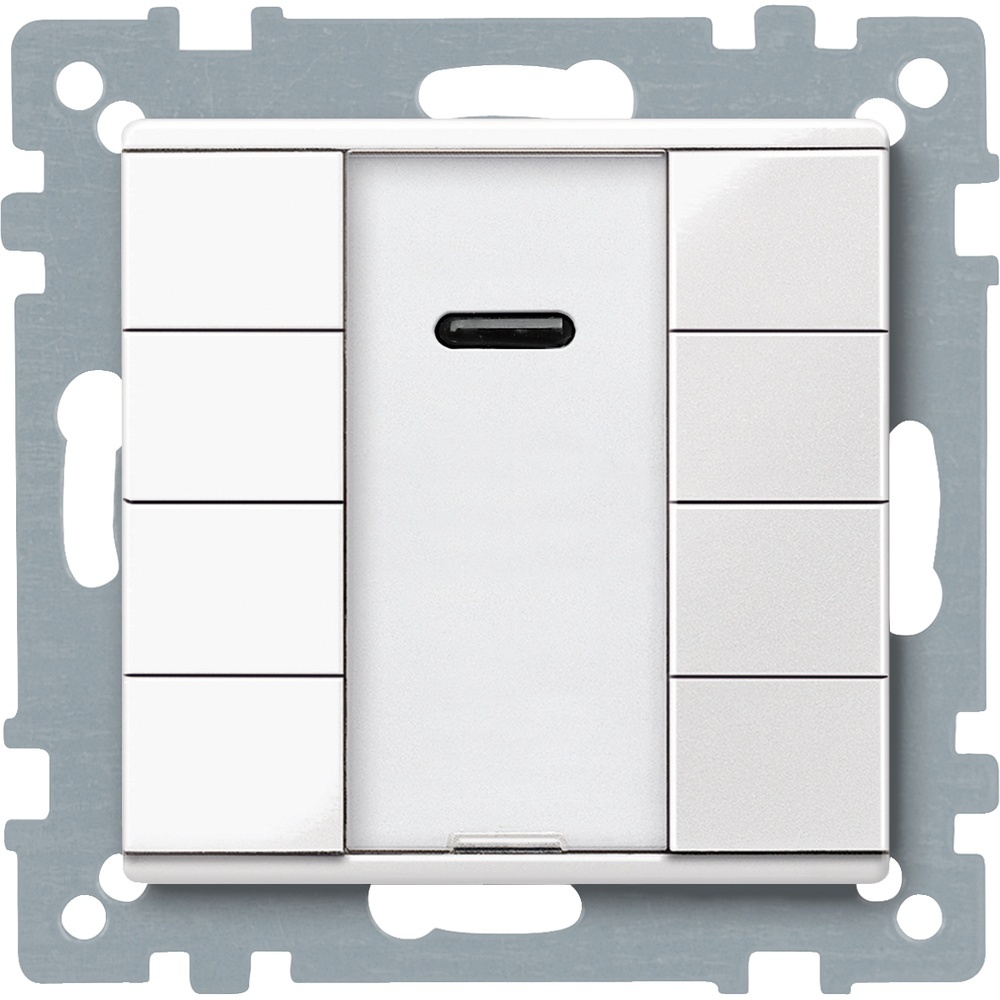 Schneider Electric Taster MTN617519 Taster 4fach plus mit IR-Empfänger, polarweiß glänzend, System M Im Design System M. Mit integriertem Busankoppler. Taster mit 8 Bedientasten, Betriebs-, Statusanzeige und Schriftfeld. Die Betriebsanzeige kann auch als Orientierungslicht verwendet werden. Die jeweiligen Funktionen der Tasten können mit einer IR-Fernbedienung angesteuert werden. Die Steuerung mit einer Merten Distance-IR-Fernbedienung ist bereits im Taster vorprogrammiert. Viele andere IR-Fernbedienungen (z. B. vorhandene TV- oder CD-Player-Fernbedienung) können am Taster angelernt werden. Das Gerät wird über eine Busanschlussklemme mit der Busleitung verbunden. Softwarefunktionen KNX: Schalten, Umschalten, Dimmen (ein-/zweiflächig), Jalousie (ein-/zweiflächig), Flanken löst 1,- 2-, 4- oder 8-Bit-Telegramme aus (Unterscheidung kurze/lange Betätigung). Flanken mit 2-Byte-Telegrammen (Unterscheidung kurze/lange Betätigung). 8-Bit-Schieberegler, Szenenabruf, Szenenspeicherung, Sperrfunktionen. Zubehör: Beschriftungsbogen für Multifunktions-Taster mit IR-Empfänger MTN6184xx.Lieferumfang: Mit Putzschutzhaube. Mit Busanschlussklemme. Material: Thermoplast brillant. Farbe: polarweiß glänzend. Hersteller Schneider Electric Nr. MTN617519 EAN Nr. 3606485099477 Warengruppe Schneider Electric Kanaleinbaugeräte