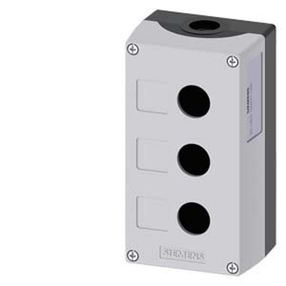 Siemens Gehäuse 3SU1803-0AA00-0AB1 Gehäuse für Befehlsgeräte, 22mm, rund, Kunststoff, grau, 3 Befehlsstellen Gehäuse für Befehlsgeräte, 22 mm, rund, Gehäusematerial Kunststoff, Gehäuseoberteil grau, 3 Befehlsstellen Kunststoff, Vertiefung für Schilder, ohne Bestückung Gehäuse SIRIUS ACT für die Montage der 22,5 mm Befehls- und Meldegeräte bei räumlich getrennter Anordnung von Steuereinheiten und Schaltschränken.Unter dem Markennamen SIRIUS ACT bietet Siemens ein einzigartiges Portfolio an Befehls- und Meldegeräten mit weltweiten Produkt-Zulassungen in drei modernen Designreihen aus robustem Echtmetall und hochwertigem Kunststoff.Das innovative Aufschnappkonzept vereinfacht die Montage so weit, dass dafür nur eine Hand und kein Spezialwerkzeug erforderlich ist. Als Montagebohrungen genügen nutfreie Löcher, da bereits ein 100%iger Verdrehschutz integriert ist.Dank der durchgängig hohen Schutzart sind die robusten Geräte industrietauglich und für den Außeneinsatz geeignet. Sogar die Reinigung mit Hochdruckstrahl ist möglich. Weder Staub, Öle noch aggressive Laugen können den zuverlässigen Betrieb stören.Neben der Standardverdrahtung können die meisten Geräte auch über PROFINET, AS-Interface oder IO-Link an die Steuerung angebunden werden. Damit reduzieren Sie Ihren Verdrahtungsaufwand, minimieren Fehlerquellen und gewinnen mehr Flexibilität.Komfortabel unterstützt der grafische Online-Konfigurator bei Auswahl und Bestellung von Einzelgeräten, Gehäusen und Beschriftungen. Umfangreiche Dokumentation (z.B. Handbuch, 3D-Daten, Anschlussdiagramm) ist verfügbar.Lieferbare Ausführungen: gelb/grau, Kunststoff/Metall, 1-6 Befehlstellen, Leergehäuse/Vorbestückung, wahlweise mit AS-Interface-Anbindung.SIRIUS ACT-Performance in Action beim Befehlen und Melden. Einfach montiert, einfach stark, einfach perfekt. Hersteller Siemens Nr. 3SU18030AA000AB1 EAN Nr. 4011209970199 Warengruppe Siemens Befehls- Meldegeräte