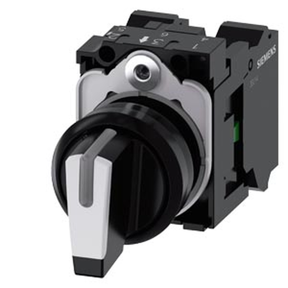 Siemens Knebelschalter 3SU1100-2BL60-3NA0 Knebelschalter, beleuchtbar, 22mm, rund, Kunststoff, schwarz, weiß, 1S, 1S Knebelschalter, beleuchtbar, 22 mm, rund, Kunststoff, weiß, Knebel, kurz, 3 Schaltstellungen I-O-II, verrastend, 10:30h/12h/13:30h, mit Halter, 1S, 1S, Federzuganschluss Knebelschalter SIRIUS ACT zur Schaltung und Steuerung elektrischer Verbraucher.Unter dem Markennamen SIRIUS ACT bietet Siemens ein einzigartiges Portfolio an Befehls- und Meldegeräten mit weltweiten Produkt-Zulassungen in drei modernen Designreihen aus robustem Echtmetall und hochwertigem Kunststoff.Das innovative Aufschnappkonzept vereinfacht die Montage so weit, dass dafür nur eine Hand und kein Spezialwerkzeug erforderlich ist. Als Montagebohrungen genügen nutfreie Löcher, da bereits ein 100%iger Verdrehschutz integriert ist.Dank der durchgängig hohen Schutzart sind die robusten Geräte industrietauglich und für den Außeneinsatz geeignet. Sogar die Reinigung mit Hochdruckstrahl ist möglich. Weder Staub, Öle noch aggressive Laugen können den zuverlässigen Betrieb stören.Neben der Standardverdrahtung können die meisten Geräte auch über PROFINET, AS-Interface oder IO-Link an die Steuerung angebunden werden. Damit reduzieren Sie Ihren Verdrahtungsaufwand, minimieren Fehlerquellen und gewinnen mehr Flexibilität.Komfortabel unterstützt der grafische Online-Konfigurator bei Auswahl und Bestellung von Einzelgeräten, Gehäusen und Beschriftungen. Umfangreiche Dokumentation (z.B. Handbuch, 3D-Daten, Anschlussdiagramm) ist verfügbar.Lieferbare Ausführungen: mehrere Farben, 2-4 Schaltstellungen, kurzer/langer Knebel oder Drehknopf, beleuchtet/unbeleuchtet (Beleuchtung auch nachrüstbar), verrastende/tastende Betätigung.Hinweis: Komplettgerät, Lieferung inklusive Halter und Module.SIRIUS ACT-Performance in Action beim Befehlen und Melden. Einfach montiert, einfach stark, einfach perfekt. Hersteller Siemens Nr. 3SU11002BL603NA0 EAN Nr. 4011209957619 Warengruppe Siemens Befehls- Meldegeräte