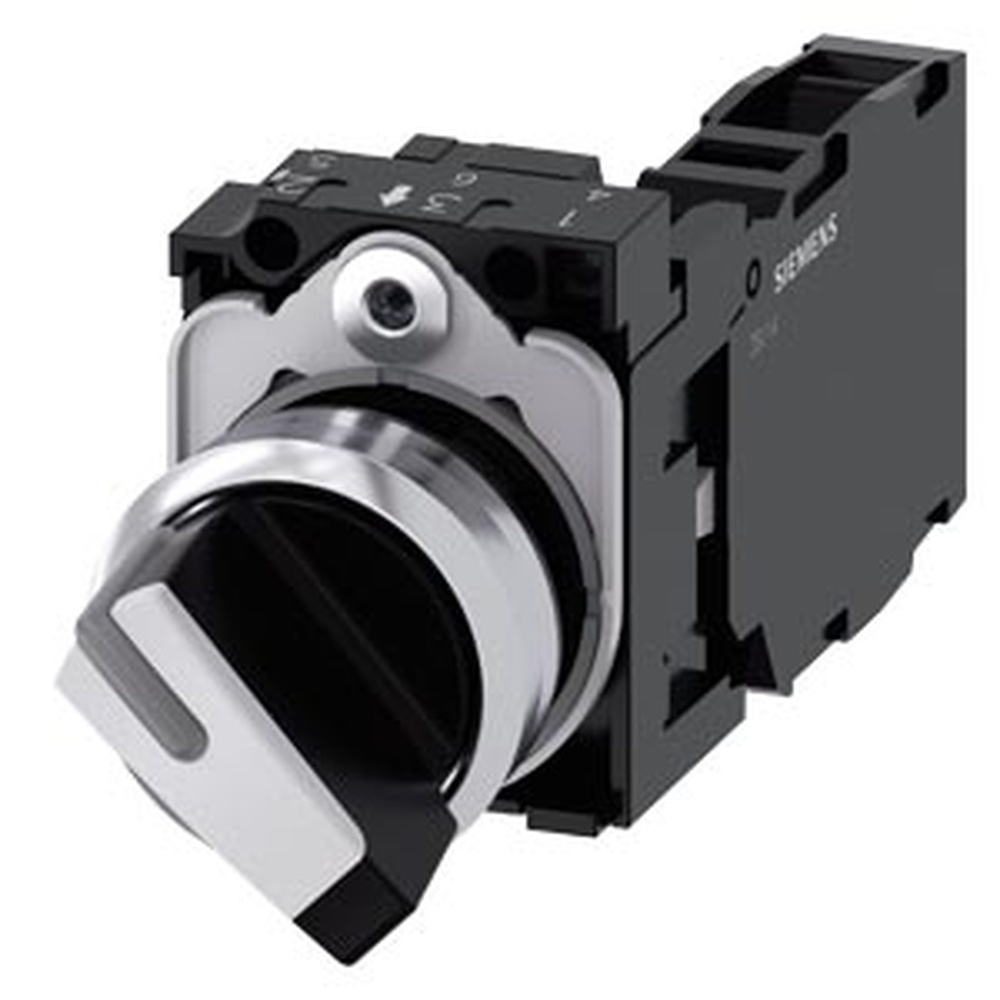 Siemens Knebelschalter 3SU1150-2BF60-1FA0 Knebelschalter, beleuchtbar, 22mm, rund, Metall, hochglanz, weiß, 1S+1Ö Knebelschalter, beleuchtbar, 22 mm, rund, Metall, hochglanz, weiß, Knebel, kurz, 2 Schaltstellungen O-I, verrastend, Schaltwinkel 90 Grad, 10:30h/13:30h, mit Halter, 1S+1Ö, Schraubanschluss Knebelschalter SIRIUS ACT zur Schaltung und Steuerung elektrischer Verbraucher.Unter dem Markennamen SIRIUS ACT bietet Siemens ein einzigartiges Portfolio an Befehls- und Meldegeräten mit weltweiten Produkt-Zulassungen in drei modernen Designreihen aus robustem Echtmetall und hochwertigem Kunststoff.Das innovative Aufschnappkonzept vereinfacht die Montage so weit, dass dafür nur eine Hand und kein Spezialwerkzeug erforderlich ist. Als Montagebohrungen genügen nutfreie Löcher, da bereits ein 100%iger Verdrehschutz integriert ist.Dank der durchgängig hohen Schutzart sind die robusten Geräte industrietauglich und für den Außeneinsatz geeignet. Sogar die Reinigung mit Hochdruckstrahl ist möglich. Weder Staub, Öle noch aggressive Laugen können den zuverlässigen Betrieb stören.Neben der Standardverdrahtung können die meisten Geräte auch über PROFINET, AS-Interface oder IO-Link an die Steuerung angebunden werden. Damit reduzieren Sie Ihren Verdrahtungsaufwand, minimieren Fehlerquellen und gewinnen mehr Flexibilität.Komfortabel unterstützt der grafische Online-Konfigurator bei Auswahl und Bestellung von Einzelgeräten, Gehäusen und Beschriftungen. Umfangreiche Dokumentation (z.B. Handbuch, 3D-Daten, Anschlussdiagramm) ist verfügbar.Lieferbare Ausführungen: mehrere Farben, 2-4 Schaltstellungen, kurzer/langer Knebel oder Drehknopf, beleuchtet/unbeleuchtet (Beleuchtung auch nachrüstbar), verrastende/tastende Betätigung.Hinweis: Komplettgerät, Lieferung inklusive Halter und Module.SIRIUS ACT-Performance in Action beim Befehlen und Melden. Einfach montiert, einfach stark, einfach perfekt. Hersteller Siemens Nr. 3SU11502BF601FA0 EAN Nr. 4011209956483 Warengruppe Siemens Befehls- Meldegeräte