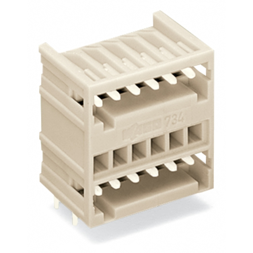 Wago Doppelstock Stiftleisten 734-410 Doppelstock-Stiftleisten mit abgewinkelten Lötstiften 10-polig Rastermaß 3,5 mm/0.138 in 100 % fehlsteckgeschützt ohne Abstützung Steckrichtung parallel zur Leiterplatte lichtgrau Wago Serie 734 EAN Nr. 4044918873017 Warengruppe WAGO Multistecksystem