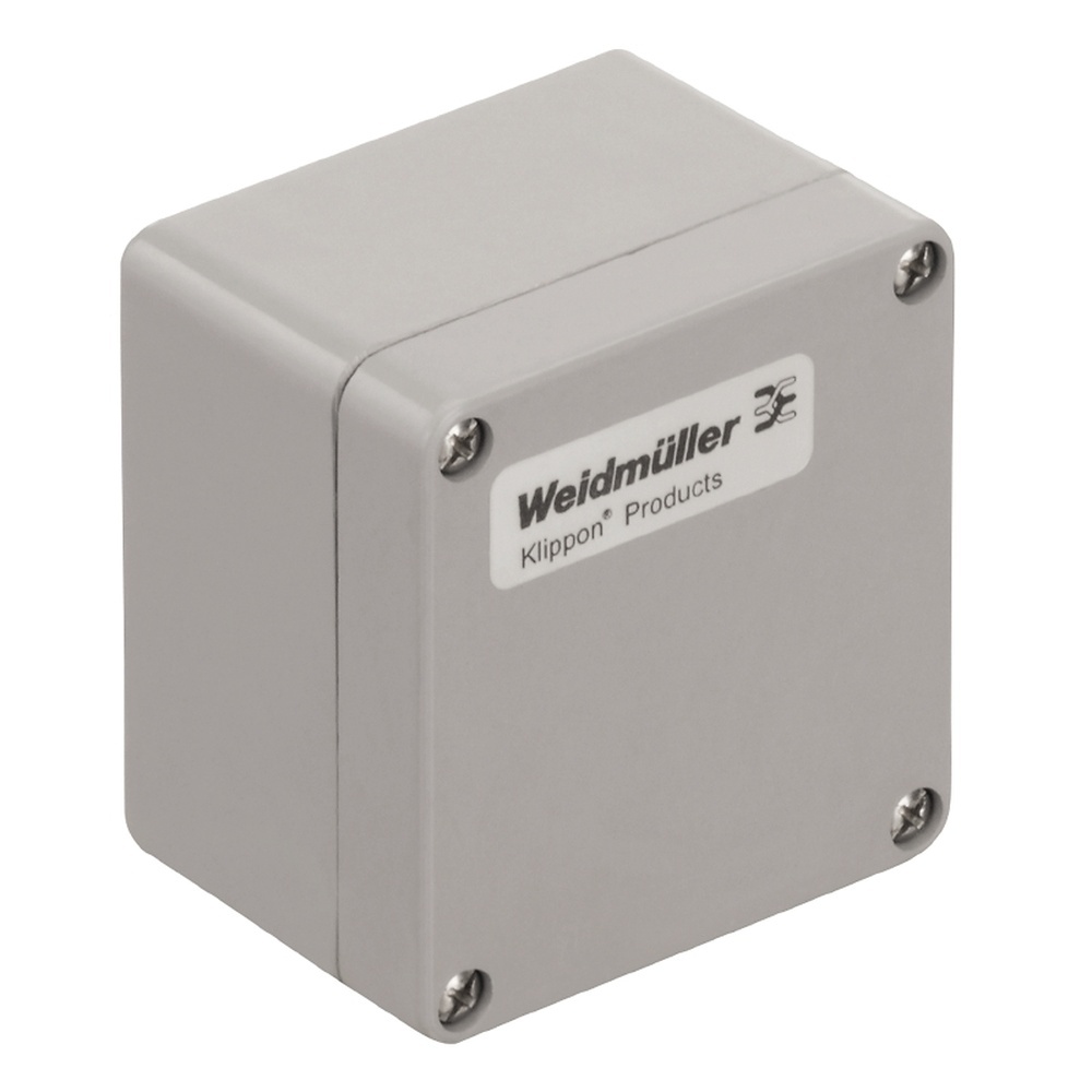 Weidmüller Gehäuse 1305810000 Typ KLIPPON POK 080806 Kunststoffgehäuse, 80x75x55 mm, glasfaser-verstärktes Polyester, unbehandelt, glänzend, silbergrau Klippon POK – PolyestergehäuseDie glasfaserverstärkten Polyestergehäuse der Reihe Klippon POK bietet eine hochwertige Lösung für elektrischen Komponentenschutz. Die Gehäuse sind ideal für den Einsatz wo Korrosionsbeständigkeit, Schlagfestigkeit und eine hohe Schutzart erforderlich sind.Merkmale ul li glasfaserverstärktes Polyester /li li 17 Baugrößen /li li 2 Standard Farben Grau ähnlich RAL 7001 und Schwarz ähnlich RAL 9011 /li li Deckel mit Edelstahlschrauben in Kreuz-/Schiltzausführung /li li Silikon oder Chloropren Formdichtung /li li Montagebohrungen außerhalb des Dichtigkeitsbereichs /li li Direktmontage in das Gehäuse oder mit innerer Montageplatte /li li Direkte Wandmontage durch Befestigungslöcher oder per Montagefüße möglich /li li Aufnahmegewinde für Tragschienen und Montageplatten /li li Weidmüller fertigt und liefert die Gehäuse-entsprechend den Kundenwünschen-komplett bestückt mit Klemmen und Verschraubungen. /li /ul Technische Daten Kunststoffgehäuse, 80x75x55 mm, glasfaser-verstärktes Polyester, unbehandelt, glänzend, silbergrau Herstellertyp KLIPPONPOK080806 EAN Nr. 4050118108224 Warengruppe Weidmüller Gehäuse