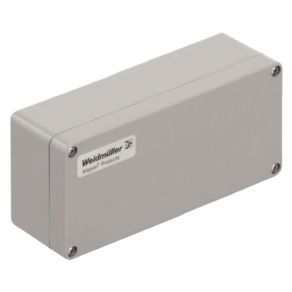 Weidmüller Gehäuse 1305840000 Typ KLIPPON POK 081906 Kunststoffgehäuse, 190x75x55 mm, glasfaser-verstärktes Polyester, unbehandelt, glänzend, silbergrau Klippon POK – PolyestergehäuseDie glasfaserverstärkten Polyestergehäuse der Reihe Klippon POK bietet eine hochwertige Lösung für elektrischen Komponentenschutz. Die Gehäuse sind ideal für den Einsatz wo Korrosionsbeständigkeit, Schlagfestigkeit und eine hohe Schutzart erforderlich sind.Merkmale ul li glasfaserverstärktes Polyester /li li 17 Baugrößen /li li 2 Standard Farben Grau ähnlich RAL 7001 und Schwarz ähnlich RAL 9011 /li li Deckel mit Edelstahlschrauben in Kreuz-/Schiltzausführung /li li Silikon oder Chloropren Formdichtung /li li Montagebohrungen außerhalb des Dichtigkeitsbereichs /li li Direktmontage in das Gehäuse oder mit innerer Montageplatte /li li Direkte Wandmontage durch Befestigungslöcher oder per Montagefüße möglich /li li Aufnahmegewinde für Tragschienen und Montageplatten /li li Weidmüller fertigt und liefert die Gehäuse-entsprechend den Kundenwünschen-komplett bestückt mit Klemmen und Verschraubungen. /li /ul Technische Daten Kunststoffgehäuse, 190x75x55 mm, glasfaser-verstärktes Polyester, unbehandelt, glänzend, silbergrau Herstellertyp KLIPPONPOK081906 EAN Nr. 4050118104875 Warengruppe Weidmüller Gehäuse
